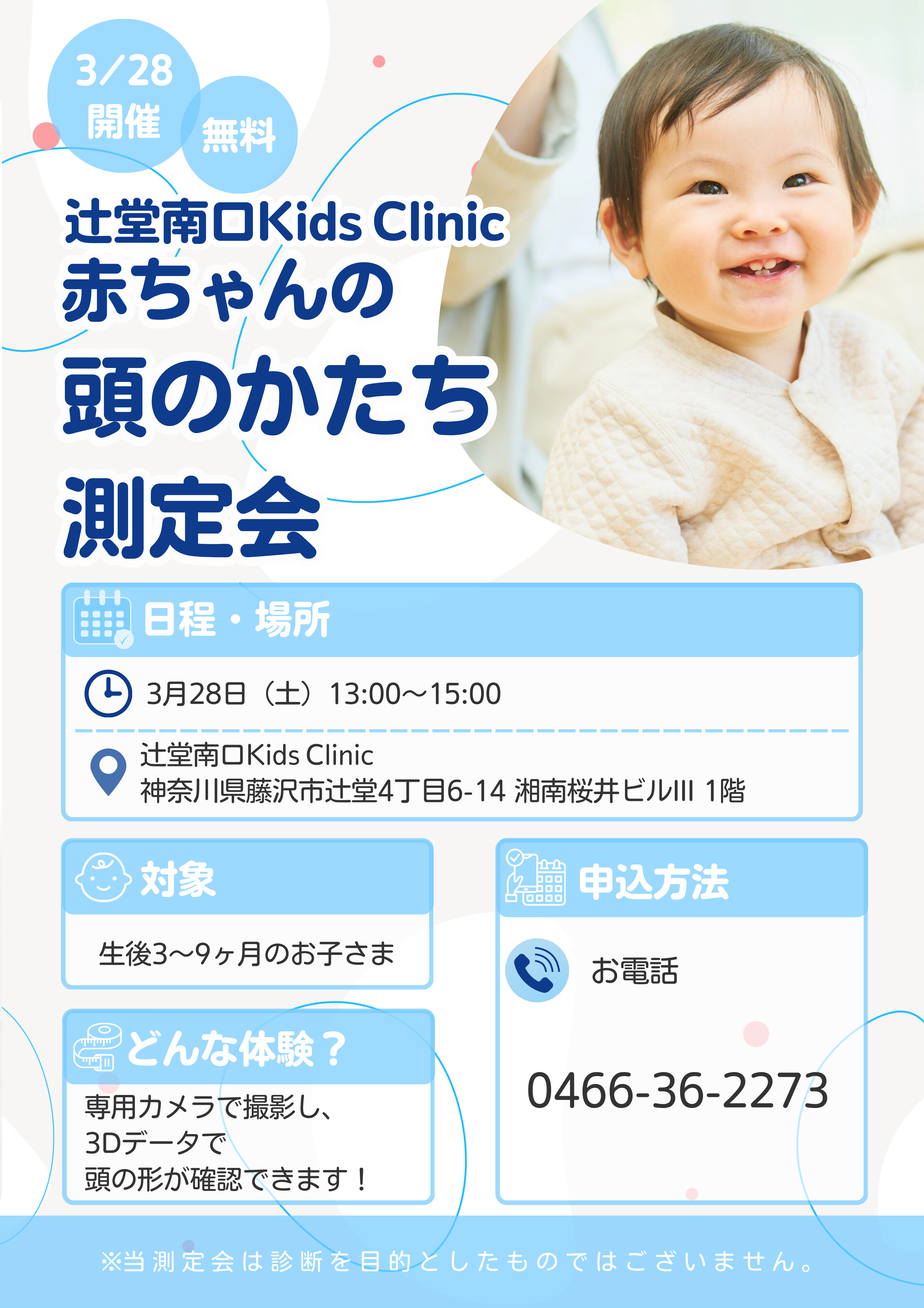 3月28日(13時~15時)に頭の形相談会を開催いたします。3か月~9か月のお子様で、向き癖があり頭の形に左右差がある、絶壁・・・など気になる事があるお子様はぜひご来院ください。頭の形を9方向から撮影し、歪みの程度を評価いたします。理学療法(うつ伏せでの過ごし方、抱っこの仕方)や、ヘルメット治療の説明も行います。先着8名のためご興味のある方は早めのご予約をお願いいたします。(電話でのご予約となります)